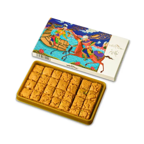۱۰۰ گرم. ابعاد ۱۰*۱۸، آرد جوانه گندم، کره حیوانی، زعفران، هل، آرد، شکر، تخم مرغ، گلوکز، ترنجبین، انگبین های گیاهی