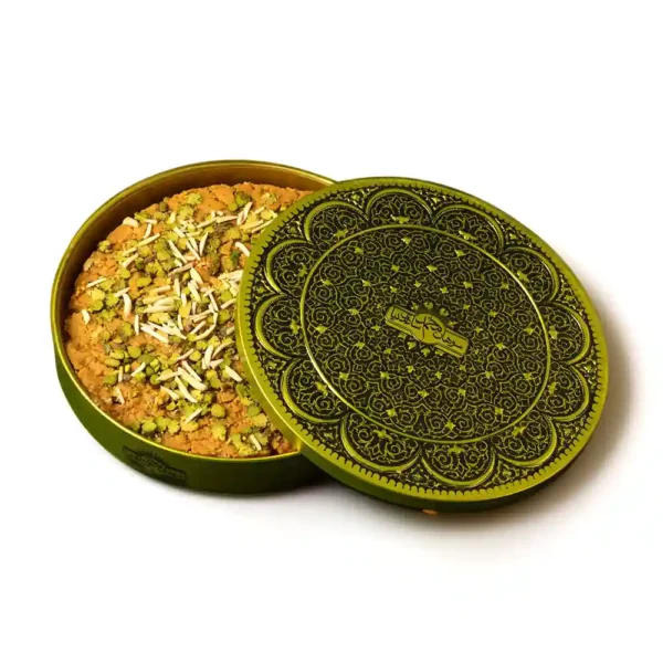 ۶۵۰ گرم. ابعاد ۲۲*۲۲، آرد جوانه گندم، کره حیوانی، زعفران، هل، آرد، شکر، تخم مرغ، مغزپسته، مغز فندق، بادام و بادام هندی