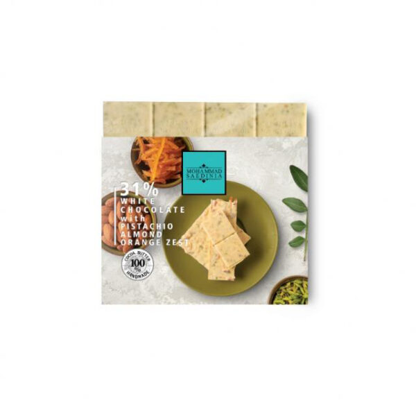 ۱۰۰ گرم. شکلات سفید ۳۱% با بادام، پسته، خلال نارنج، مواد تشکیل دهنده: شکر، کره کاکائو، خمیر کاکائو، امولسیفایر: سویا لسیتین (E۳۳۲)، وانیل طبیعی، بادام، پسته، خلال نارنج، وزن تمامی محصولات با احتساب بسته بندی میباشد