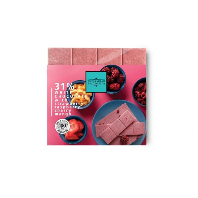 شکلات سفید ۳۱ درصد با توت فرنگی، تمشک، انبه، آلبالو/ مواد تشکیل دهنده: شکر، کره کاکائو، خمیر کاکائو، امولسیفایر: سویا لسیتین(E۳۳۲)، وانیل طبیعی، توت فرنگی، تمشک، انبه، آلبالو / وزن:۱۰۰ گرم، وزن تمامی محصولات با احتساب بسته بندی میباشد