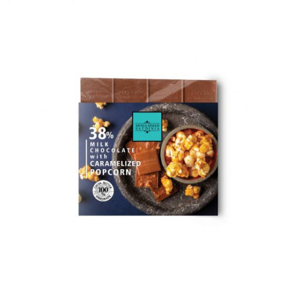 ۱۰۰ گرم. شکلات شیری ۳۸% با پاپکرن کارامل، مواد تشکیل دهنده: شکر، کره کاکائو، خمیر کاکائو، امولسیفایر: سویا لسیتین(E۳۳۲)، وانیل طبیعی، پاپکرن، وزن تمامی محصولات با احتساب بسته بندی میباشد