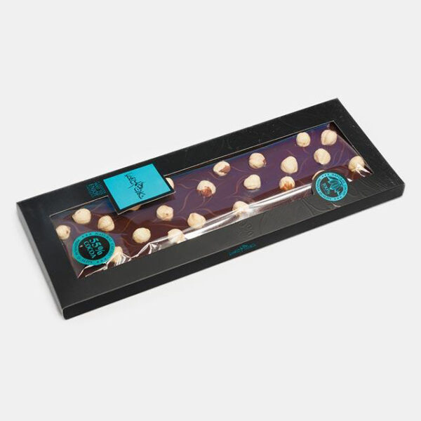 ۱۱۰ گرم. ابعاد ۲۷*۱۱، شکلات خالص با مغز فندق، شکلات تلخ: مس کاکائو، شکر، کره کاکائو، امولسیفایر، سویالسیتین، وانیل طبیعی